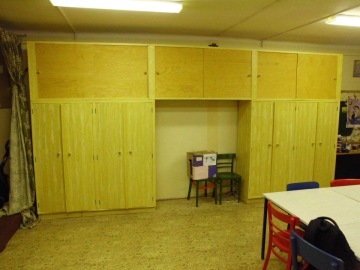 Když byly skříně zbaveny laku, začal jsem montovat (okolo 26.12) nástavbové skříňky. To mi už Rychlík pomáhal každý den. Pevnost nových skříněk (z dřevotřísky síly 18 mm) je dána jak návrhem, tak lepidlem Dispercol D3 a tak hromadou vrutů 6x70 mm.