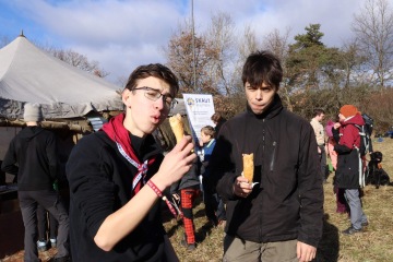 Nedbali jsme těchto podvratných činitelů a pokračovali do první větší zastávky – na Kytínskou louku. Tam jsme sejmuli ze svých beder těžké batohy a navázali kontakt s ostatními pražskými skauty, jež zde připravovali louku na nástup v jednu hodinu. Účastníci Svojsíkova závodu z řad vedení také poznali své(ho) staré(ho) známé(ho), ale to by byl příběh zase na jindy. Téměř všichni se vydali ke stanu obklopeného obrněnými vozy, aby doplnili energii párkem v rohlíku za příznivou cenu, načež počali směňovat podivné papírky zvané Brděnky. Po chvíli dorazili také skauti a skautky a nenechali se dlouho přemlouvat k poskytnutí chalvy.