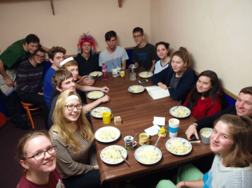 Po krátkém bloudění některých z nás jsme doputovali na základnu. V jedné z místností se k našemu velkému nadšení nacházel stolní fotbálek. To jemu nyní vděčíme za zničená zápěstí… Naší roverskou krasojízdou jsme pokračovali s večeří. Každý měl svou, jídlo jsme měli zdravé i nemocné, tučné i hubené, těžké i jednoduché. Prostě všechno. Dále proběhl klasický řev provázený hrou na kytaru a později jsme se uchýlili k hudbě reprodukované. Rytmický Jungle Speed nijak moc netěšil stavitele vratkých věží. Pozdě v noci jsme se konečně uchýlili ke spánku.