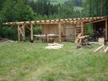 Zametání odřezané kůry (Jana, Kořínek, Brčko), stavba jídelny pokračuje zvesela dále George, Mirek, David, Lukáš...).