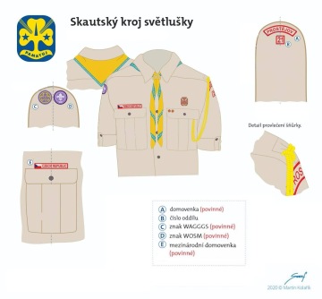 - skautský šátek dle správné věkové katerogie (světlušky - žlutý s lemem, skautky - modrý s lemem)